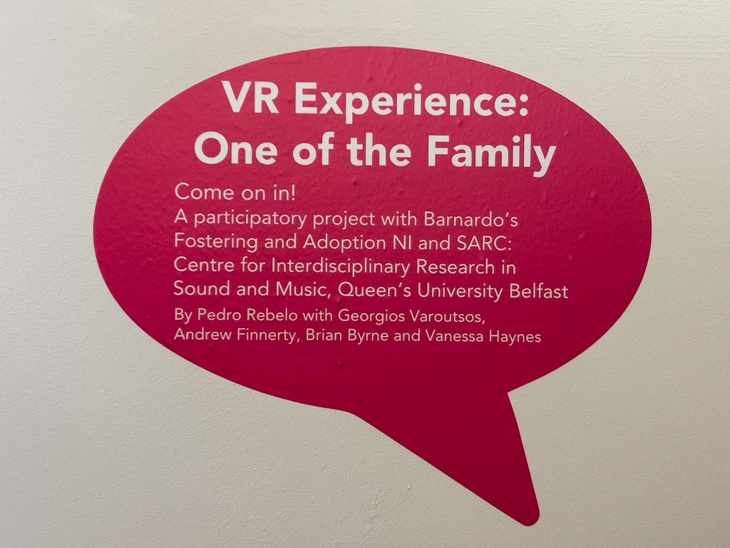 The team from SARC has been working with Barnardos NI and participating families, to create an immersive experience that combines sound, 360º video and a three channel 24 minute film, to tell foster and adoption stories from a first person perspective. Exploring the everyday, the places and experiences of families, this participatory artwork provides a unique insight into what it is like to be part of a family who foster or adopt in Northern Ireland.